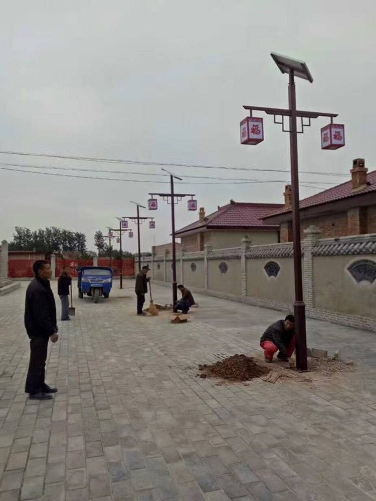 甘肅省慶陽市西峰區太陽能庭院景觀燈工程,采購了我們蘭光照明倆種形式的配套組合景觀燈具,采用單板雙頭20W,中國福燈籠造型,燈體主體采用深棕色配中國紅,配合3.5米高中國紅庭院柱燈,相互照應配合,使得整體景區體現出濃濃的喜慶特色。